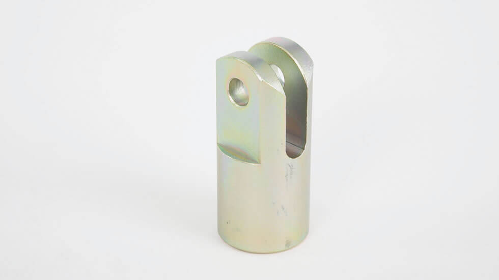 Peça metálica cilíndrica prateada com furo e ranhura