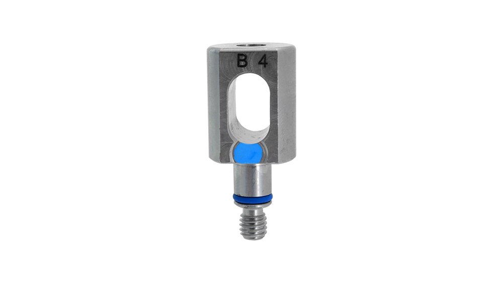 Peça metálica cilíndrica com furo retangular e parafuso na base