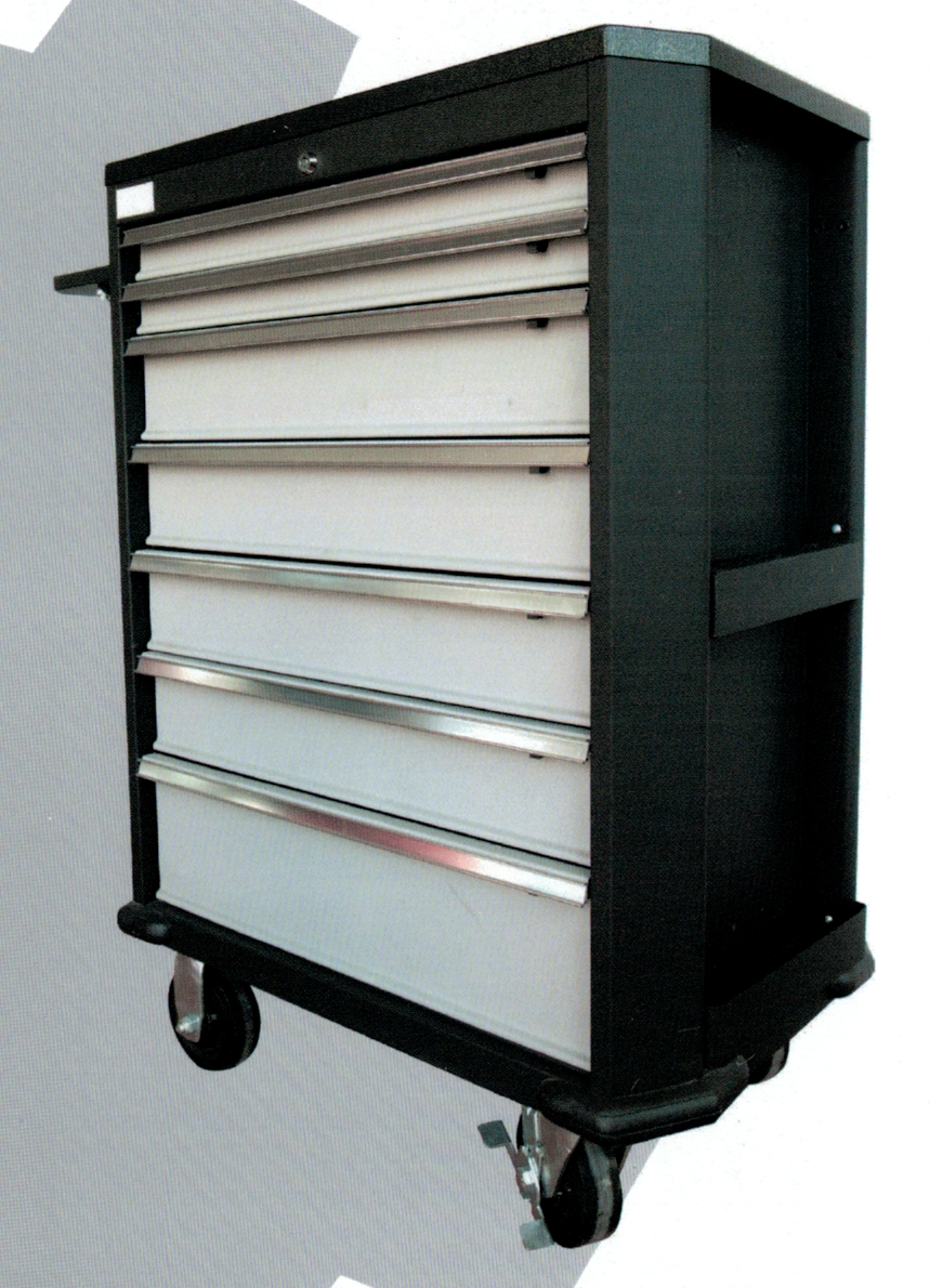 Carrinho de ferramentas preto com gavetas brancas e rodas