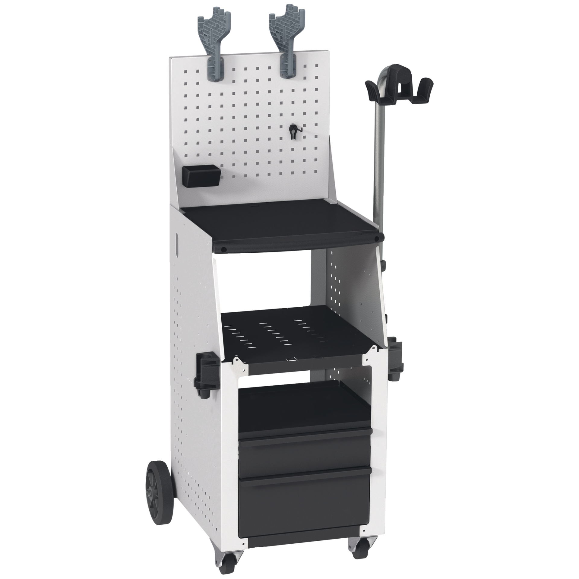 Carrinho organizador de ferramentas em metal branco com rodas e gavetas pretas