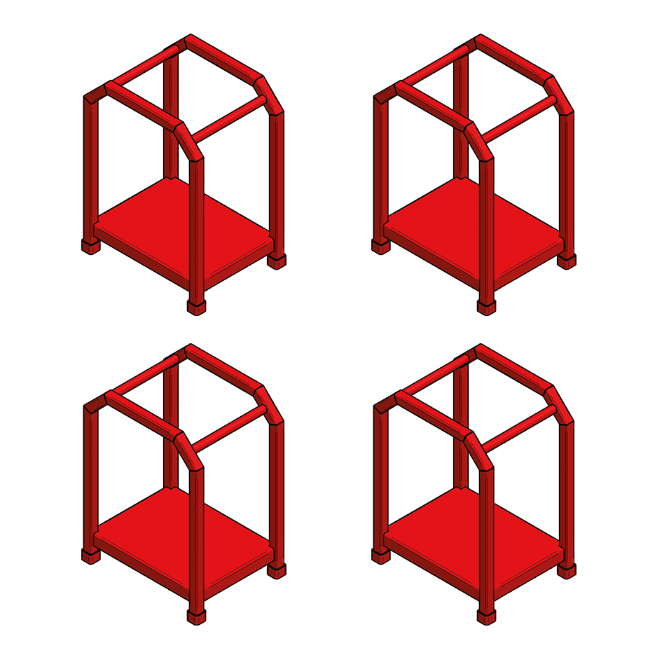Quatro carrinhos pequenos vermelhos com diferentes estruturas tubulares superiores sobre fundo preto