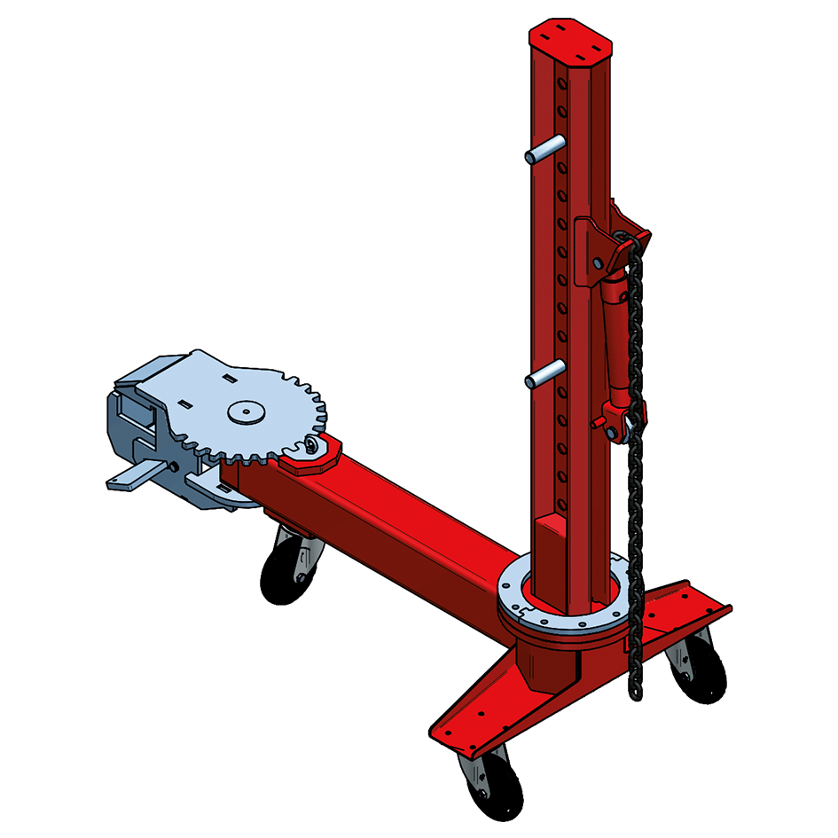 Dispositivo mecânico vermelho e cinza com rodas e corrente