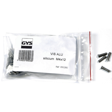 Pacote de parafusos metálicos prateados com etiqueta GYS e texto VIS ALU silicium M4x12