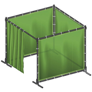 Estrutura metálica com três painéis verdes de tecido, formando uma cabine aberta numa das faces
