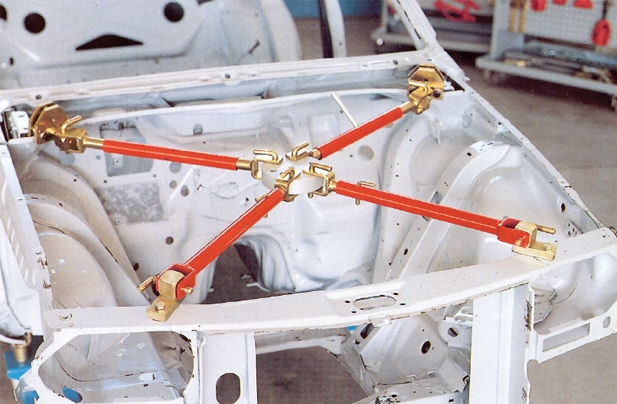 Estrutura metálica branca de carro com varas transversais vermelhas e juntas douradas numa oficina