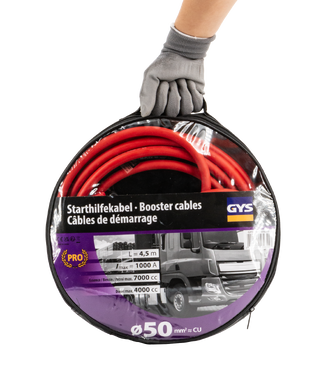 Cabo de arranque GYS Booster cables vermelho numa embalagem de plástico transparente com etiqueta preta e roxa