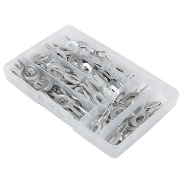 Caixa translúcida com presilhas metálicas prateadas organizadas em compartimentos