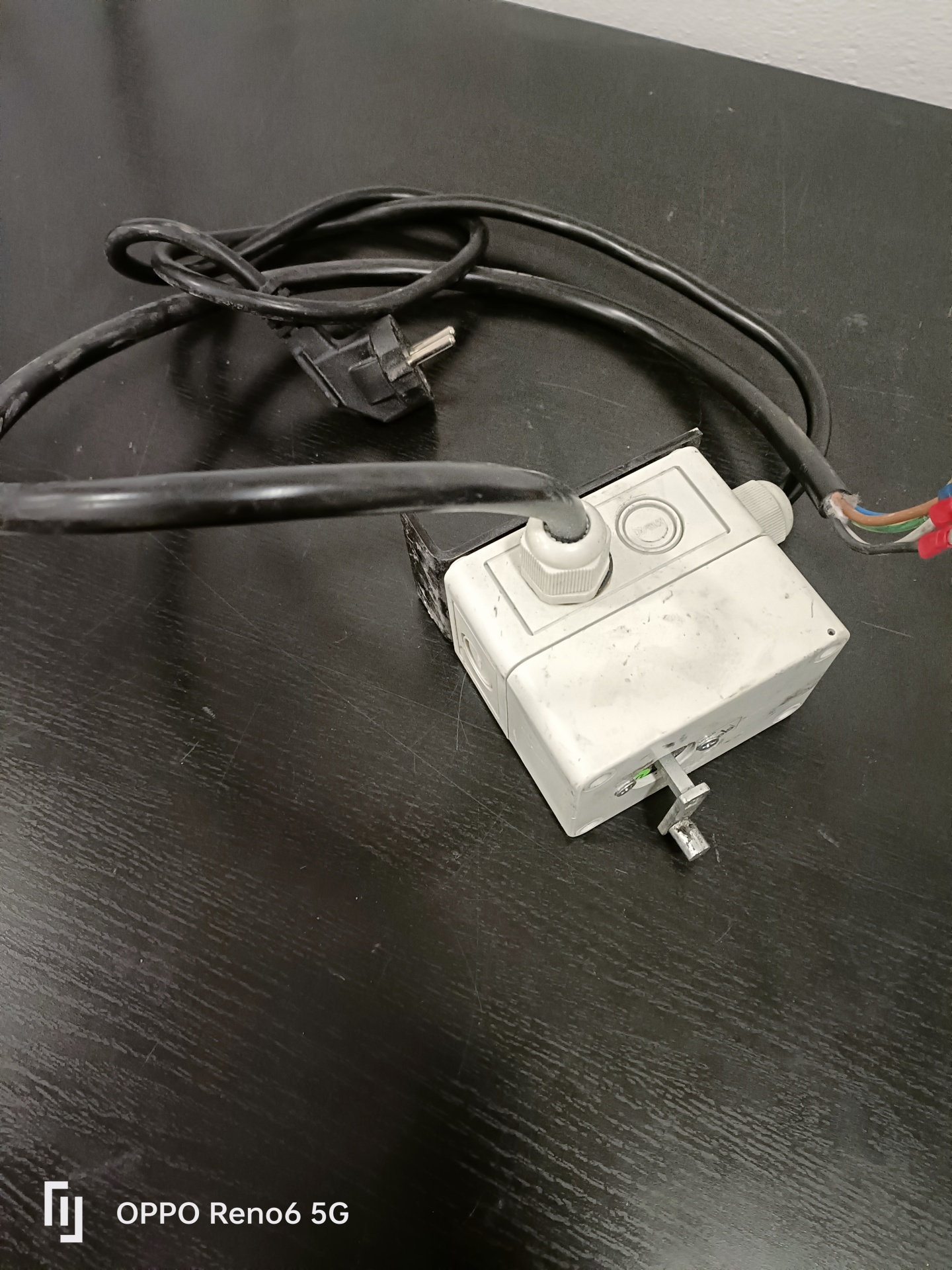 Caixa elétrica branca com fios e cabo preto sobre superfície preta