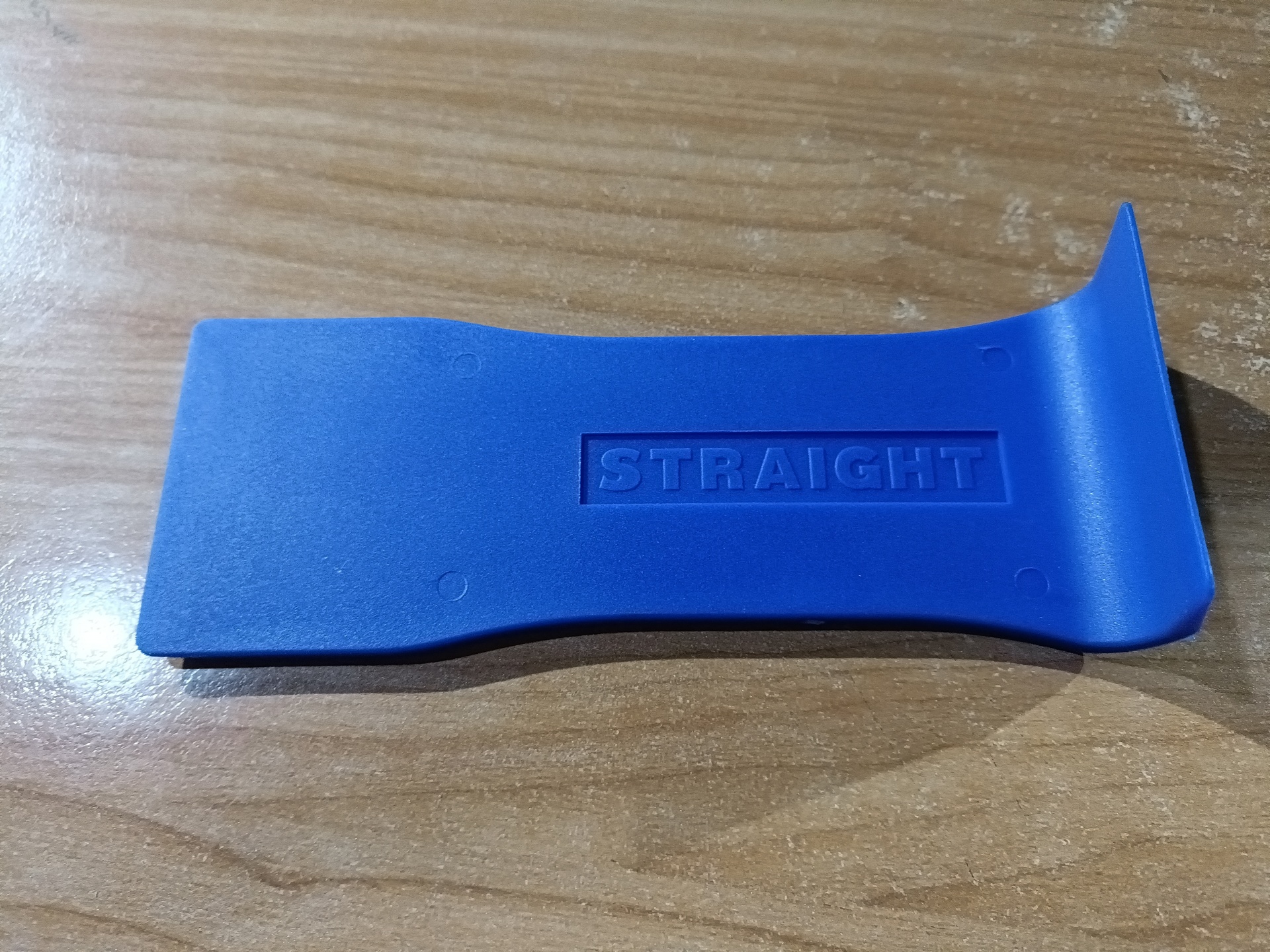 Ferramenta plástica azul com inscrição STRAIGHT sobre mesa de madeira clara
