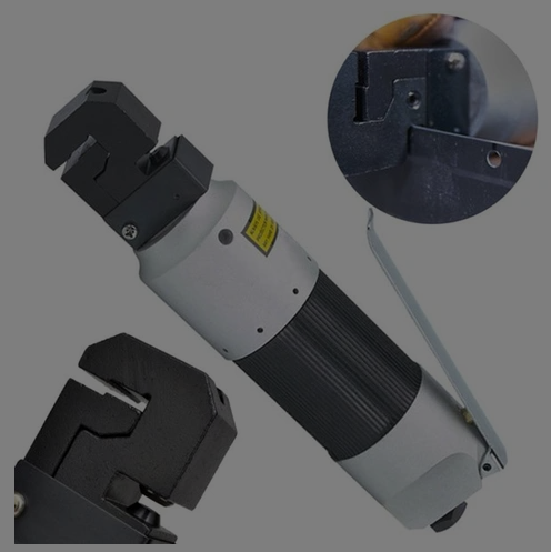 Ferramenta de corte pneumática com punho preto, alavanca metálica e etiqueta amarela