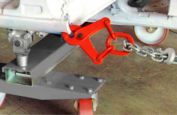 Gancho de engate vermelho ligado a corrente e estrutura metálica cinzenta com rodas.