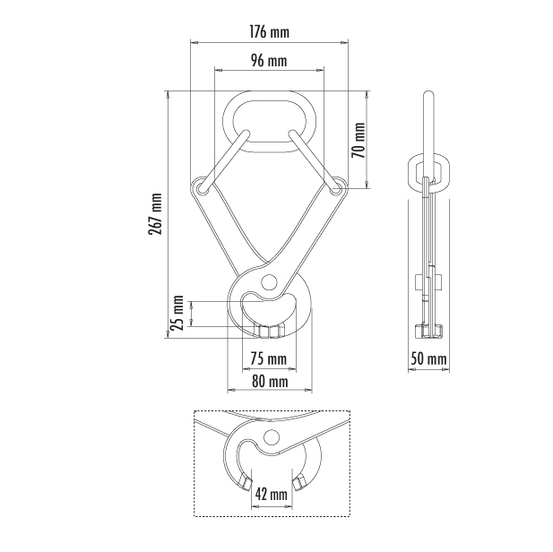 Desenho técnico em preto e branco de gancho de metal com medidas em mm
