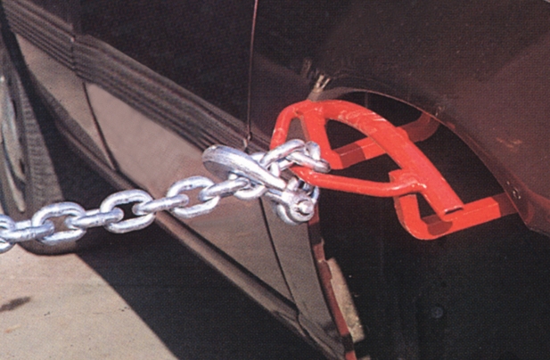 Gancho vermelho preso na parte traseira de carro preto com corrente prateada segurando o veículo