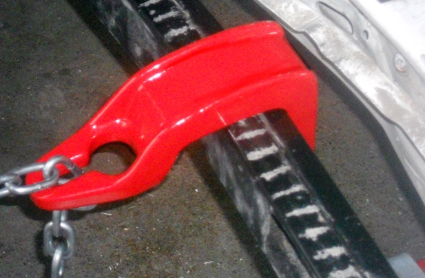 Gancho de reboque vermelho metálico com corrente e superfície preta riscada ao fundo