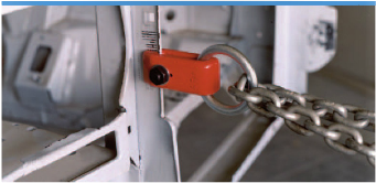 Cadeado vermelho em corrente metálica prateada presa a estrutura metálica cinza.