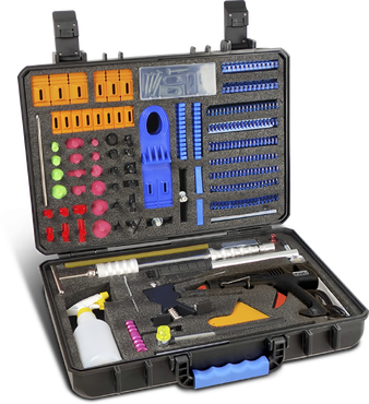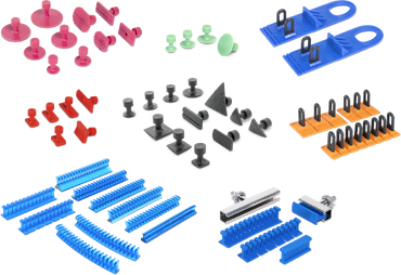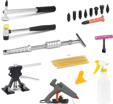 Conjunto de ferramentas para reparação automóvel com martelo, extrator, pistola de cola quente e pulverizador.