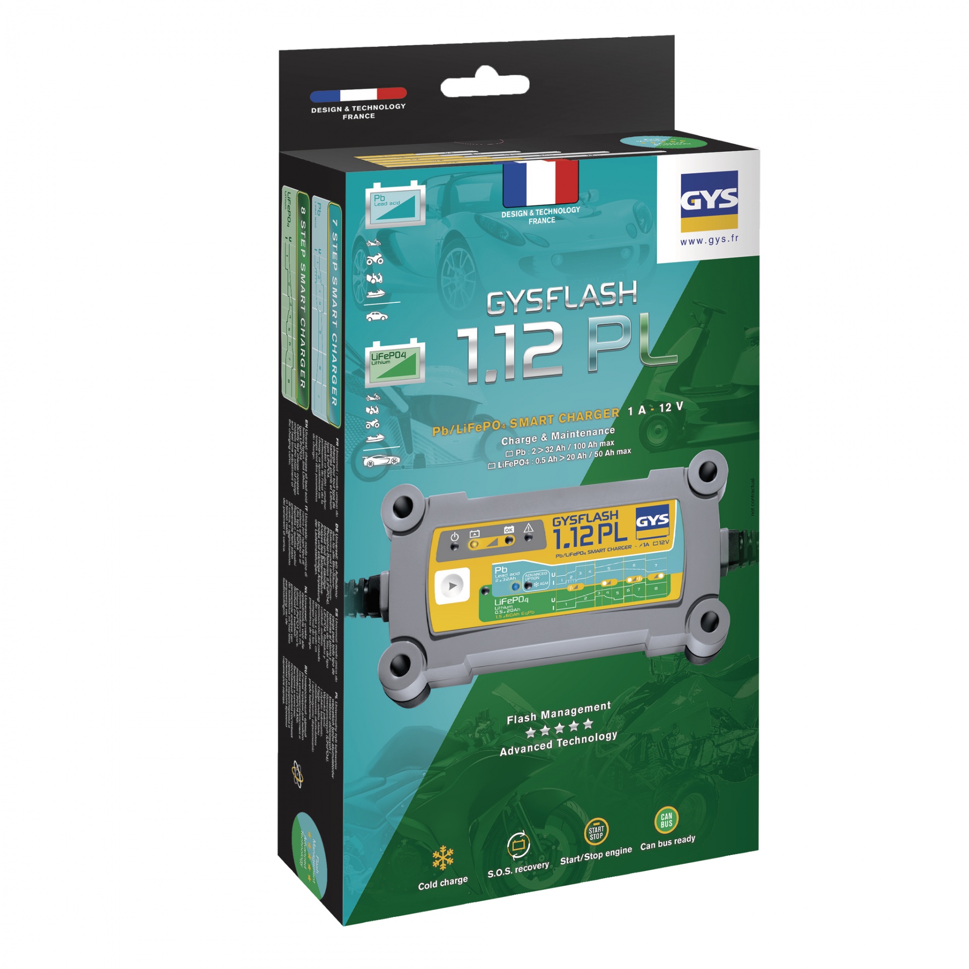 O GYSFLASH 1.12 PL (1 A) é um carregador avançado projetado para recarregar baterias de chumbo e fosfato de ferro-lítio (LiFePO4) de 12 V. Ideal para motocicletas, jet skis, karts e cortadores de grama.
