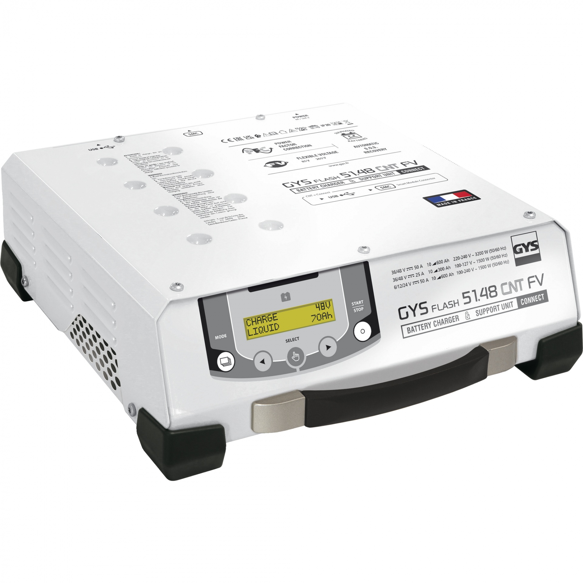 O GYSFLASH vertical 51.48 CNT FV é um carregador CONNECTED de alta potência de 50 A com tecnologia inverter. Mantém uma bateria de 6 V, 12 V, 16 V, 24 V, 36 V, 48 V, de chumbo-ácido ou lítio, a uma tensão perfeitamente estabilizada durante as fases de diagnóstico. Também garante uma qualidade de carga ideal para a manutenção dos veículos mais avançados. A sua conectividade USB torna-o 100% personalizável.