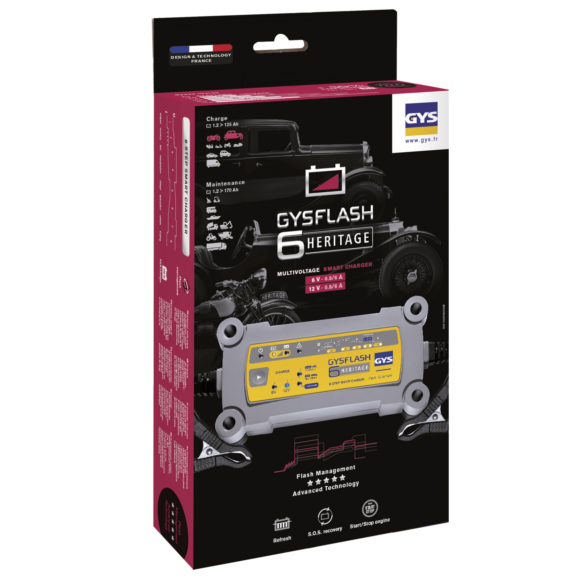 O GYSFLASH HERITAGE 6A foi projetado para recarregar as baterias de veículos clássicos de 6 V (carros, motocicletas, etc.) e as baterias de veículos atuais de 12 V (de motocicletas a veículos utilitários).
