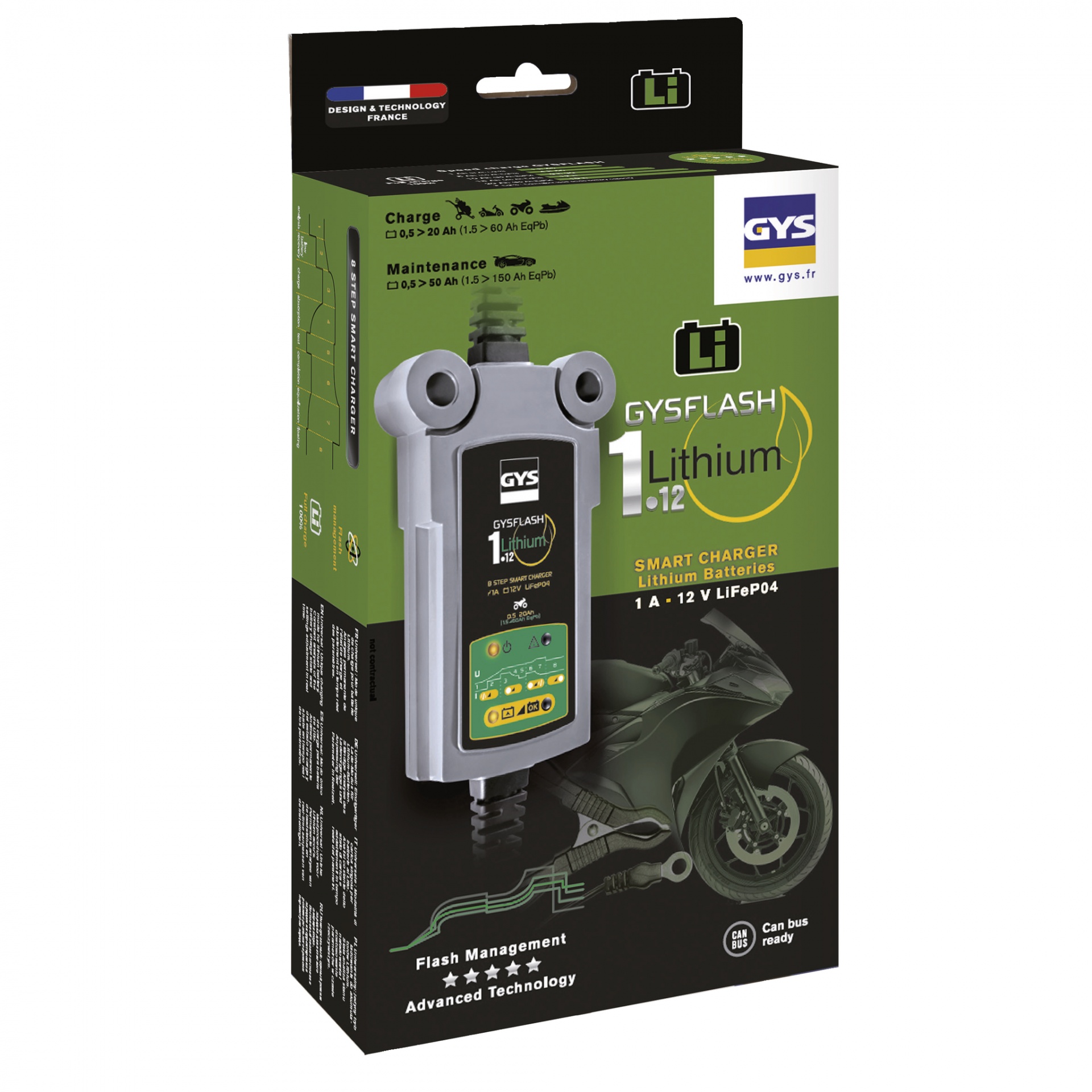 O GYSFLASH 1.12 Lithium (1 A) é um carregador avançado projetado especificamente para recarregar e manter baterias de fosfato de ferro-lítio de 12 V (LiFePO4).