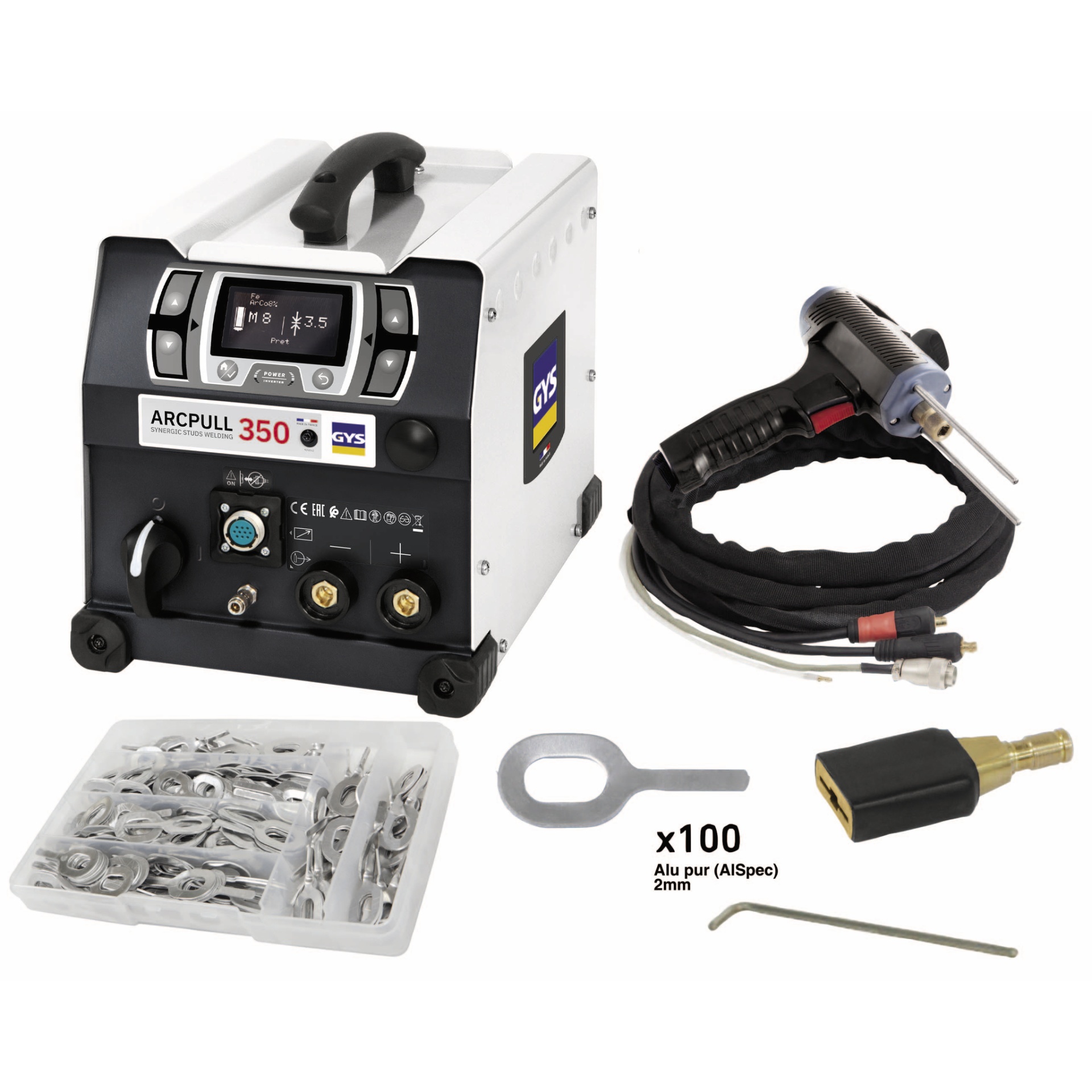 A GYSPOT ARCPULL 350 é uma estação de arco especialmente desenvolvida para carrocerias. Ela pode soldar pinos de aço e alumínio de até 8 mm de diâmetro. É adequada para remoção de amassados em chapas metálicas, com a instalação de anéis de tração e hastes de extração de rebites. Sua interface intuitiva, detecção de polaridade, sinergias, pistola motorizada e operação monofásica de 230 V CA facilitam a soldagem de acessórios.