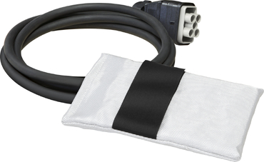 Cabo elétrico preto com conector de sete pinos e bolsa branca com faixa preta