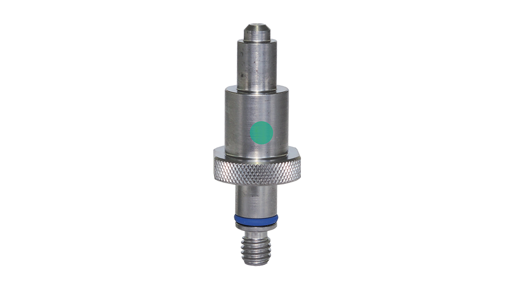 Peça metálica cilíndrica com rosca e anel azul sobre fundo branco