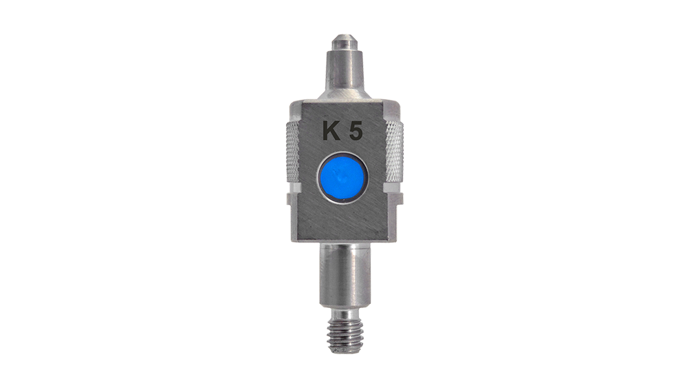 Conector metálico prateado com botão azul e inscrição K 5
