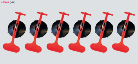 Seis bombas vermelhas para pneus com base preta alinhadas em fundo claro