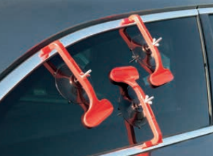 Sistema de fixação vermelho com ventosas em janelas de carro cinza