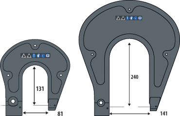 Dois dispositivos em forma de U cinza escuro com medidas internas e ícones na parte superior