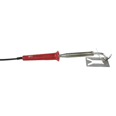 Ferro de soldar com cabo vermelho e suporte metálico