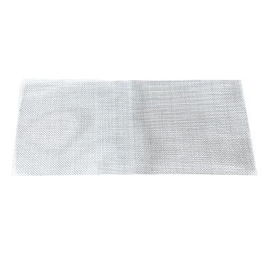 Rede metálica retangular de malha fina prateada sobre fundo branco