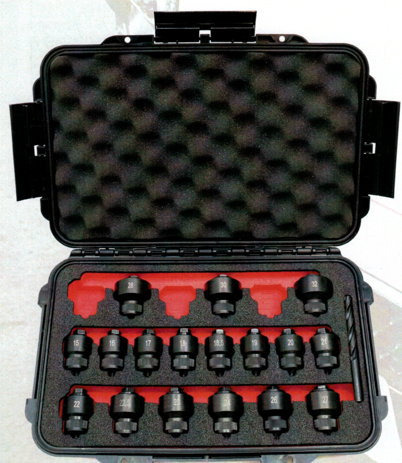 Caixa de ferramentas preta com adaptadores numerados de 15 a 32, interior vermelho e espuma preta na tampa