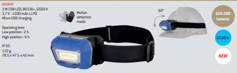 Lanterna frontal azul com faixa elástica preta e indicação técnica ao lado.
