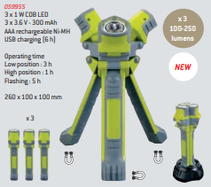 Lanterna LED multifunções amarela com três luzes, recarregável via USB, com texto de especificações técnicas