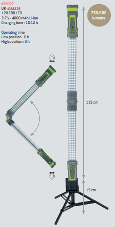 Lâmpada LED portátil ajustável com tripé e especificações técnicas visíveis