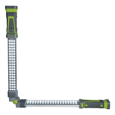 Lanterna LED portátil com braço articulado cinza e verde com LEDs acesos