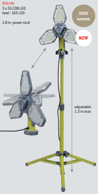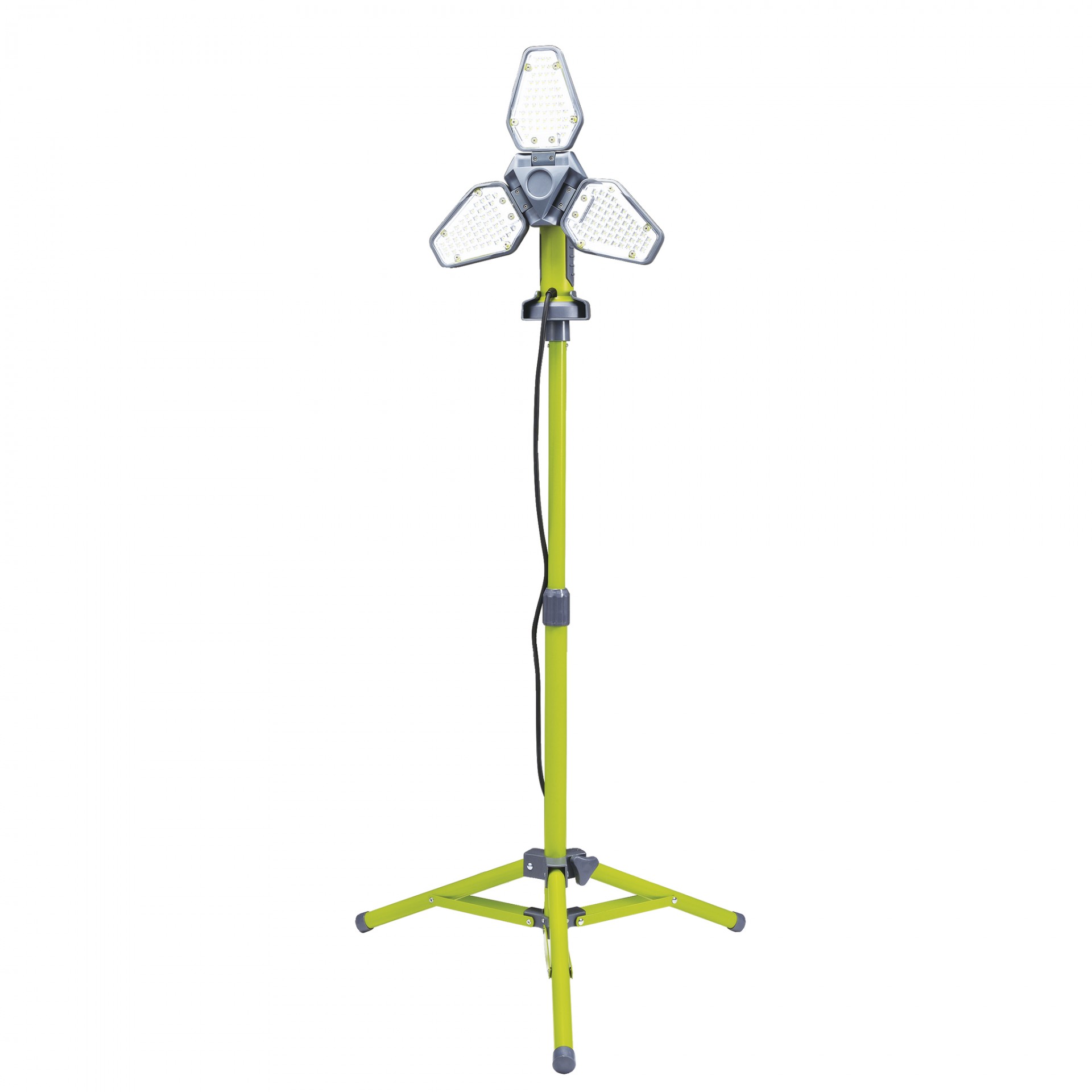 Luz de trabalho LED tripla com suporte tripé amarelo em fundo branco