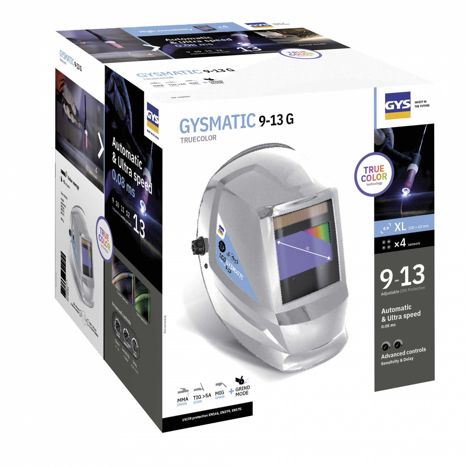 Indispensável para a segurança, a cobertura optoeletrônica GYSMATIC 9-13 G protege o rosto e os olhos do soldador de UV, infravermelho e projeções. Totalmente automática, a máscara muda de transparente para tingida em uma fração de segundo a partir do momento da preparação. Fornecido com fita para a cabeça, liberta as mãos do soldador e oferece todo o conforto necessário ao trabalho de soldadura.