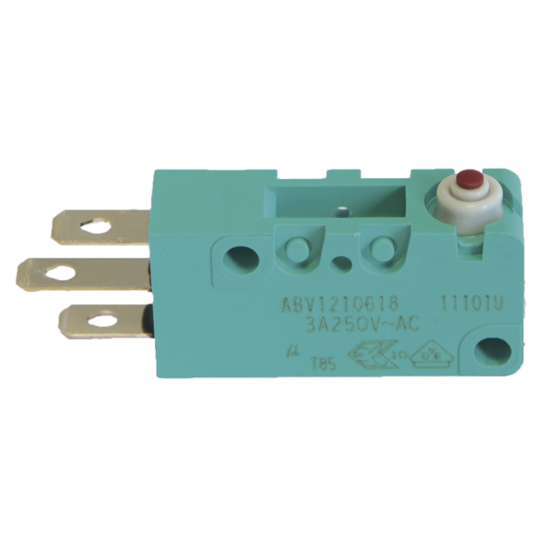 Interruptor microborda azul claro com três terminais metálicos e botão branco com centro vermelho