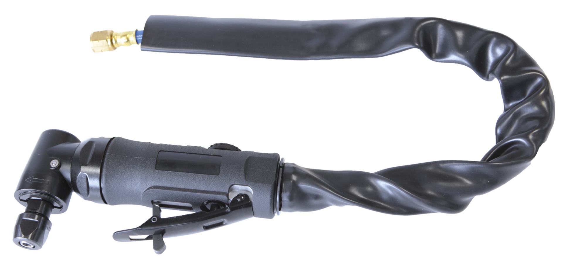 ferramenta pneumática preta com cabo revestido e conexão metálica dourada