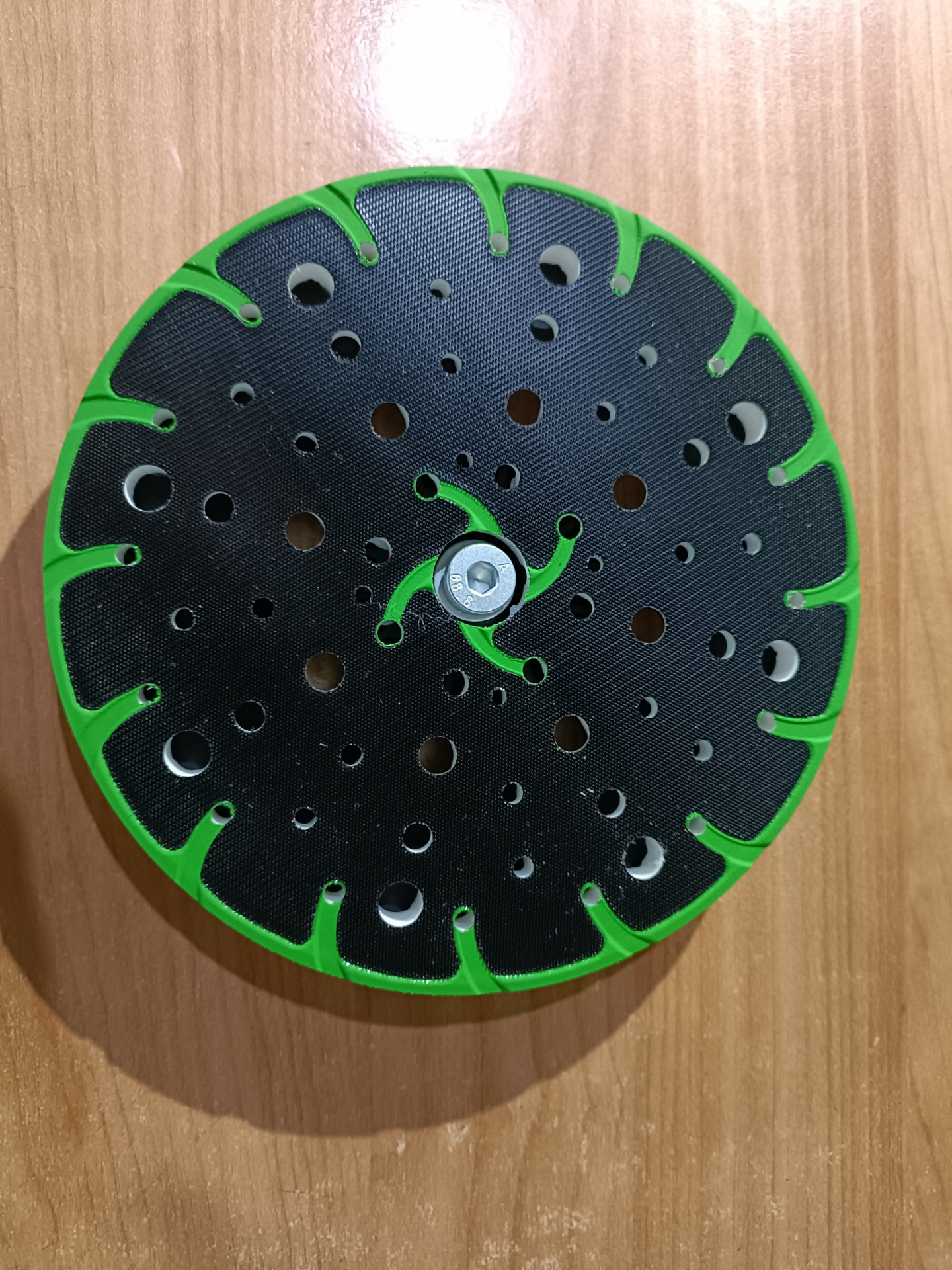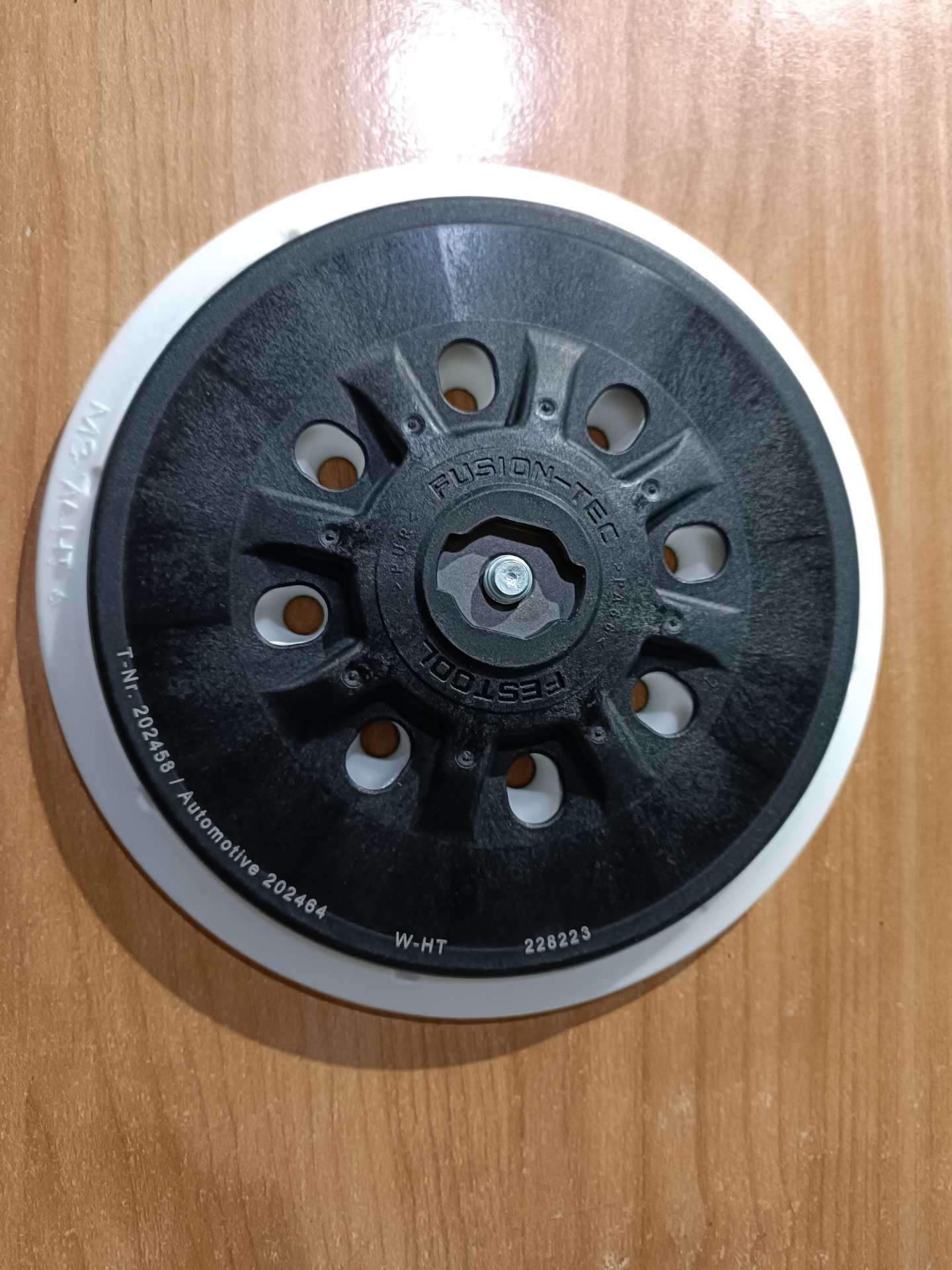 Disco de lixamento preto e branco com texto FUSION-TEC FESTOOL sobre chão de madeira