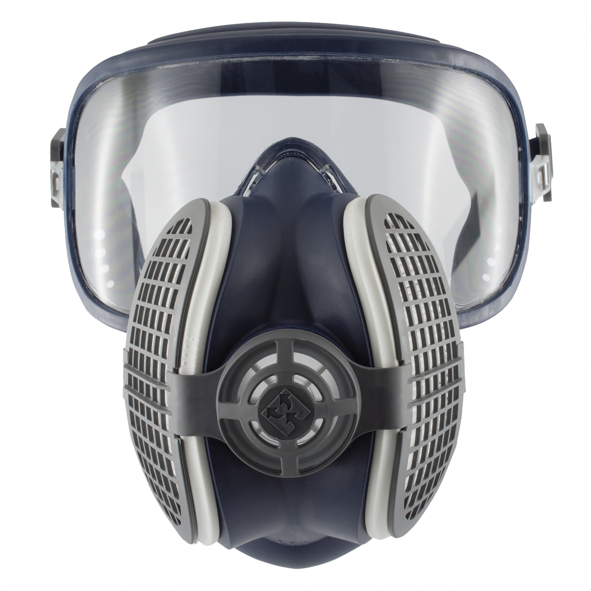 Máscara de proteção respiratória azul escuro com filtros cinza e visor transparente