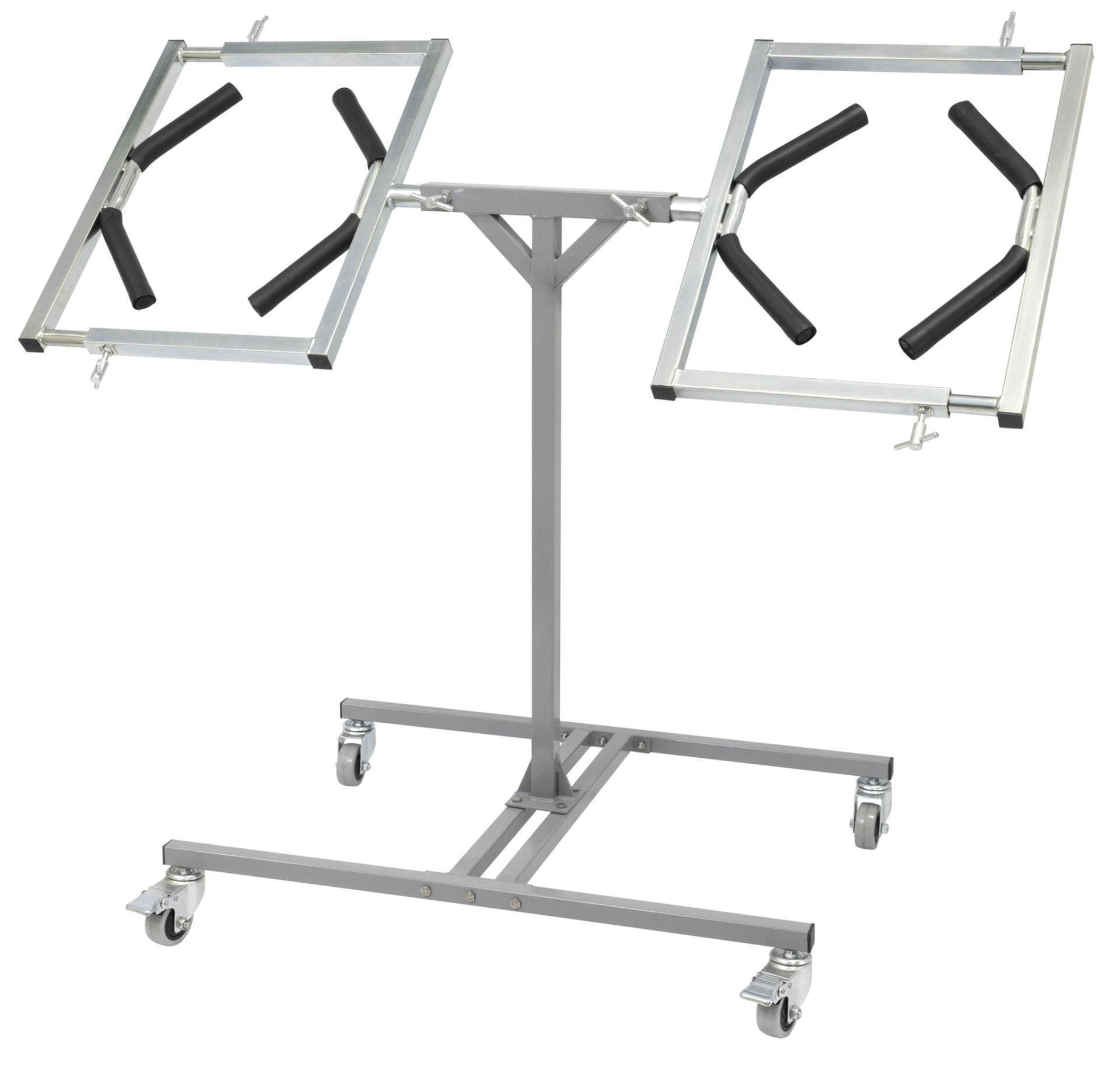 Suporte metálico móvel com duas estruturas retangulares e rodas
