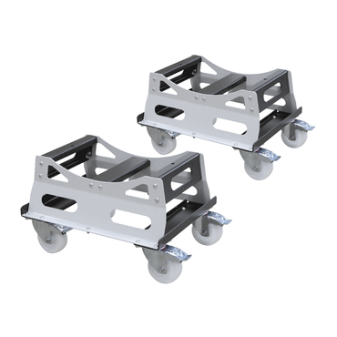 Suportes metálicos com rodas e travões sobre fundo branco