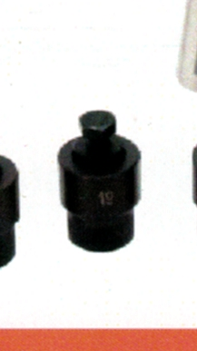 Três soquetes metálicos pretos sobre superfície branca, centro com marcação 19