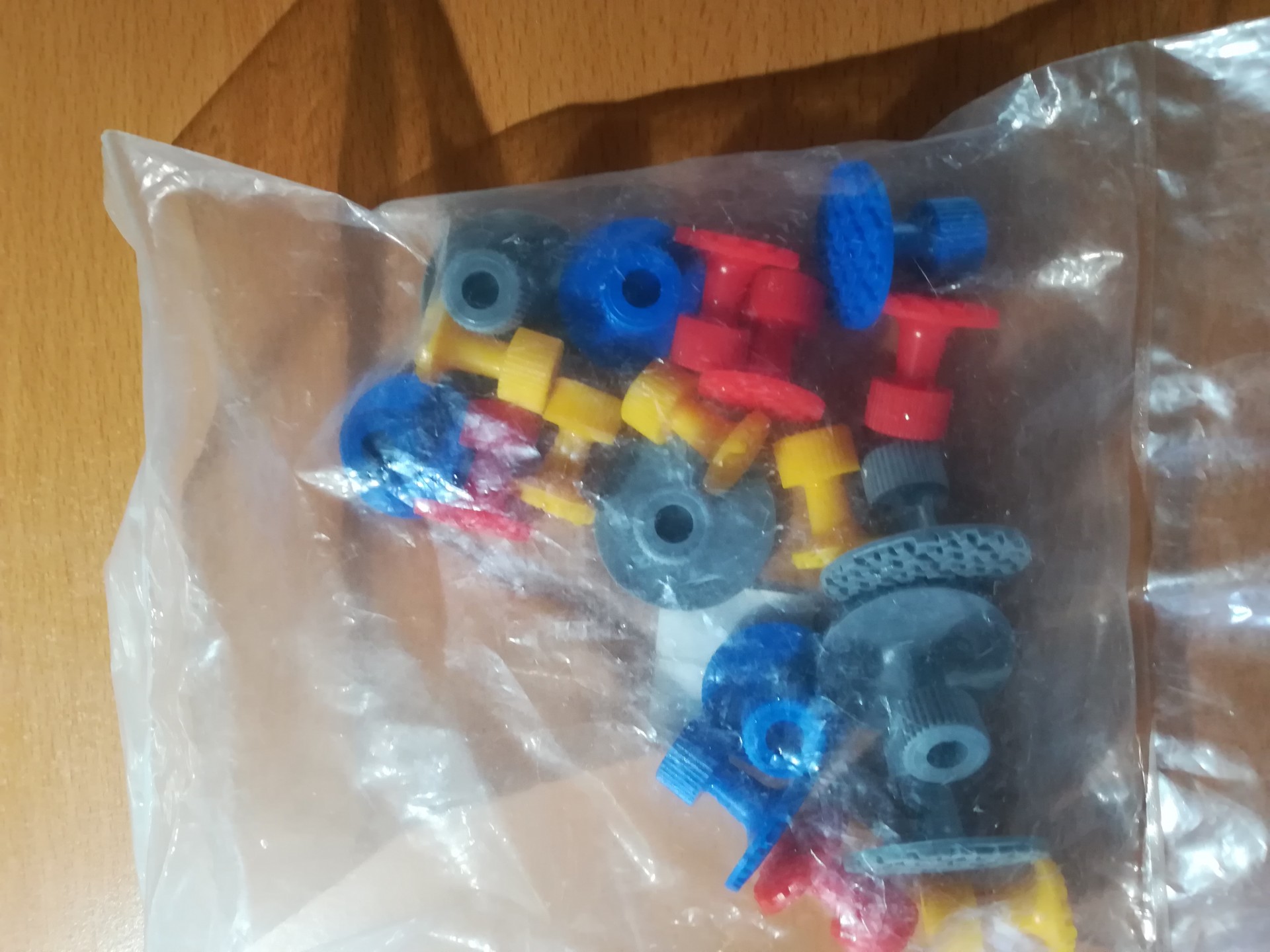 Pacote transparente com peças de construção coloridas em superfície de madeira
