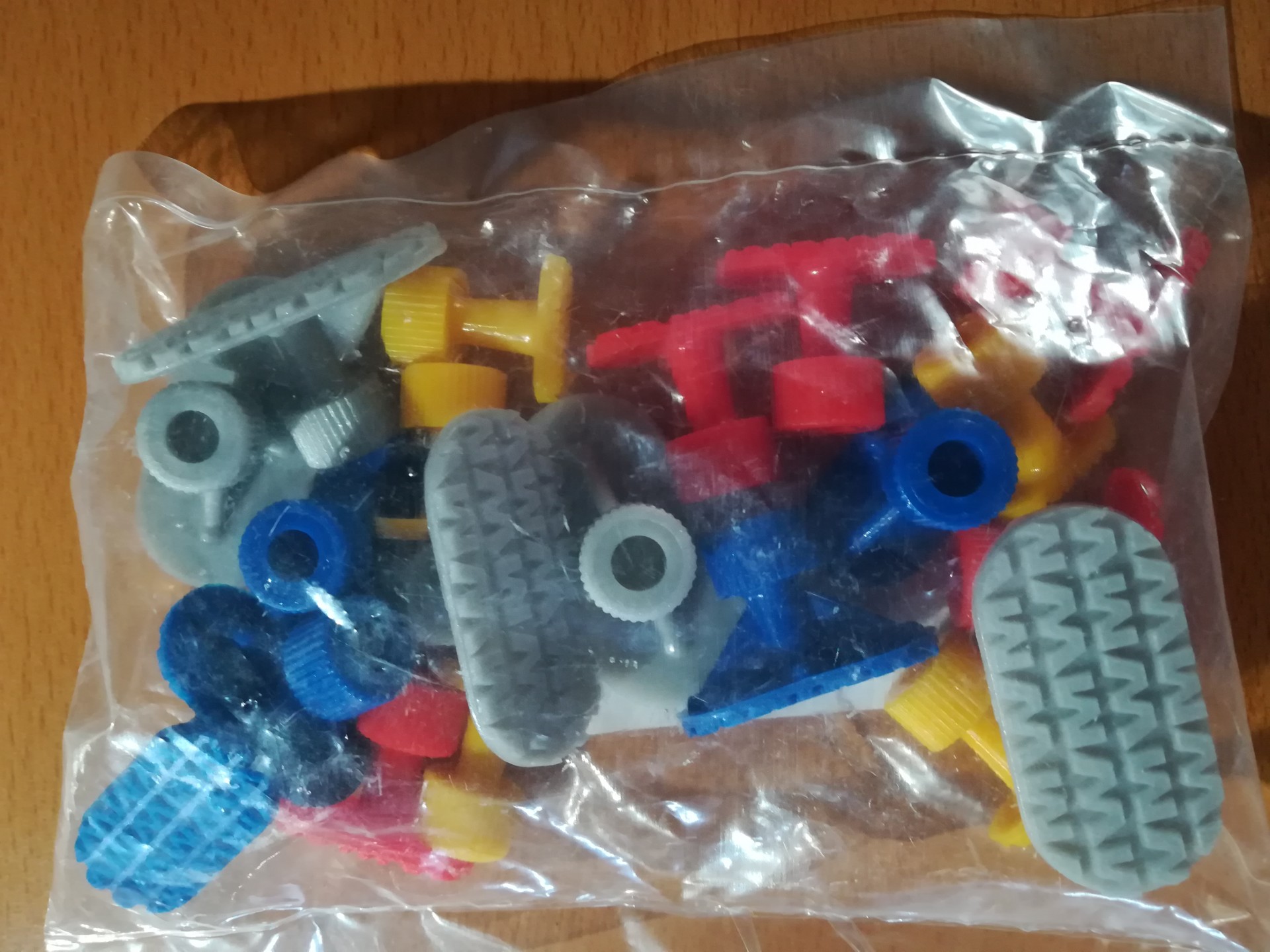 Pacote com peças de plástico coloridas para montar, sobre uma mesa de madeira.