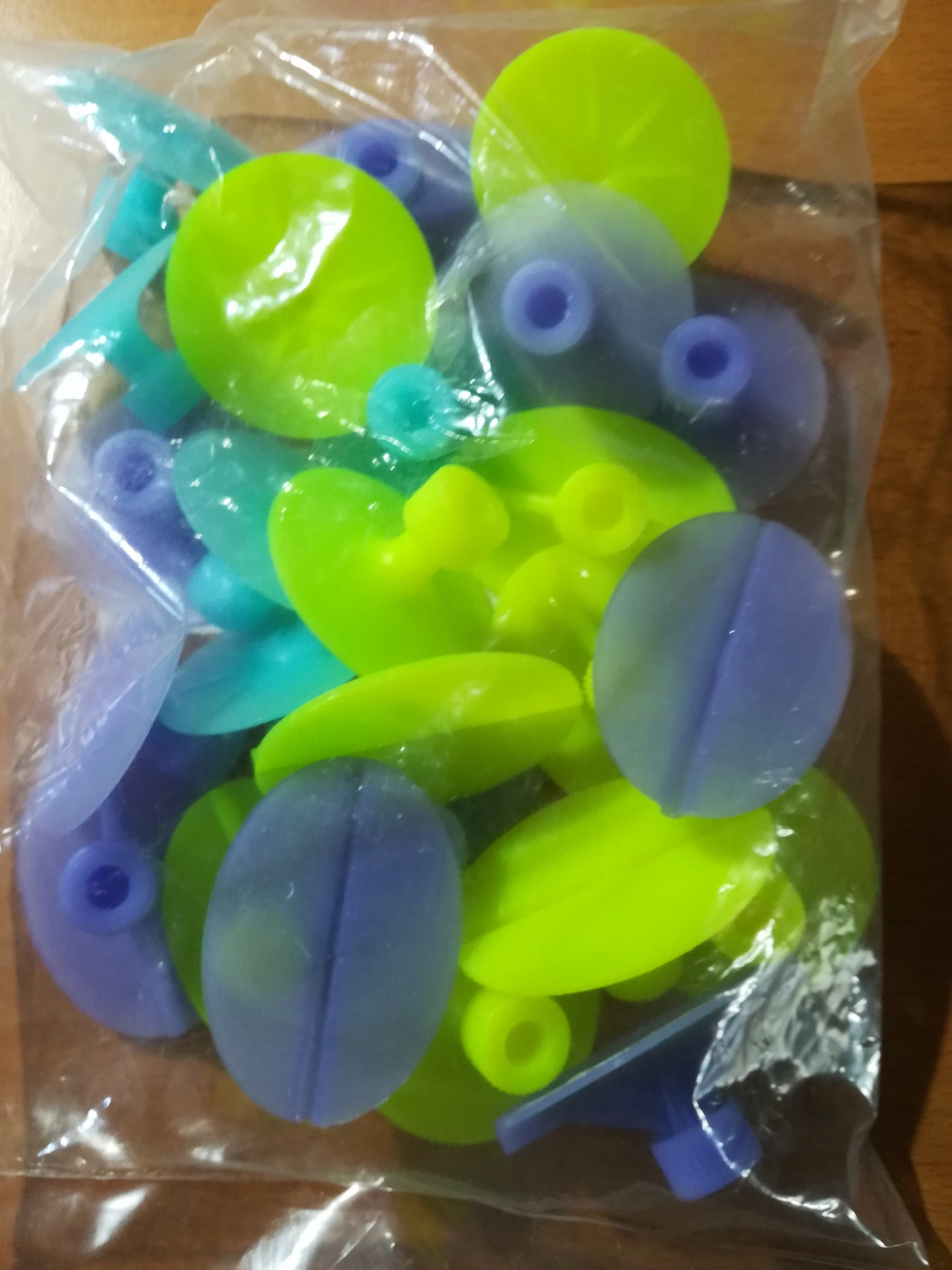 Pacote com ventosas de plástico verde e roxo sobre madeira